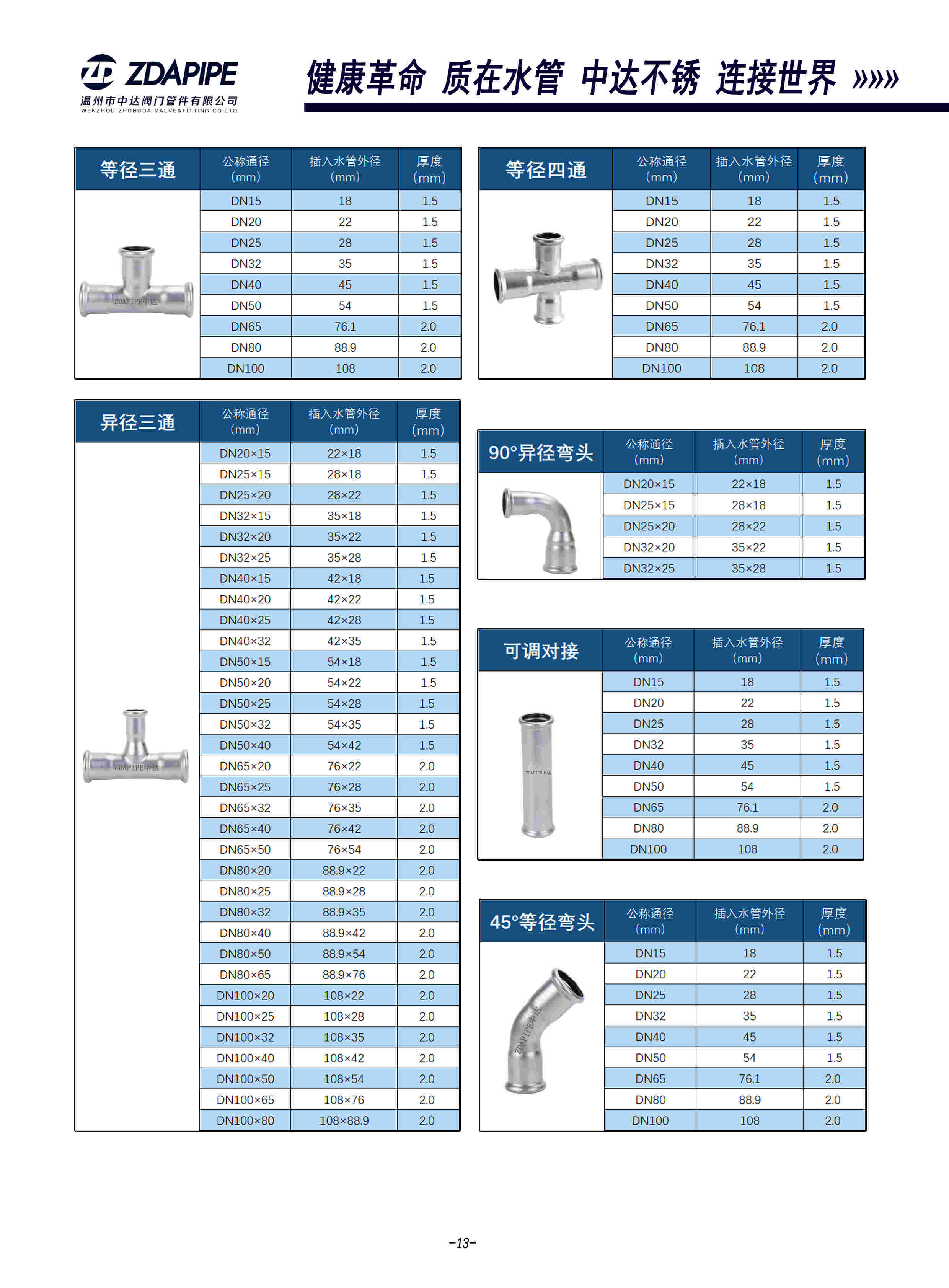 - 用途范圍:卡壓式管件廣泛應(yīng)用于市政自來(lái)水管道工程,新建小區(qū)直飲水工程,工業(yè)與民用 建筑、賓館、公共建筑、睬氣供應(yīng)等分供水系統(tǒng)。給水,排水,二次供水,太陽(yáng)能,水務(wù)工程,自來(lái)水公司,醫(yī)院,學(xué)校,酒店,賓館,天然氣工程,自來(lái)水工程,直飲水工程,家裝水管工程,工業(yè)管道工程,水處理工程,清潔能源工程,綠色能源,健康革命,質(zhì)在水管,中達(dá)不銹,連接世界。