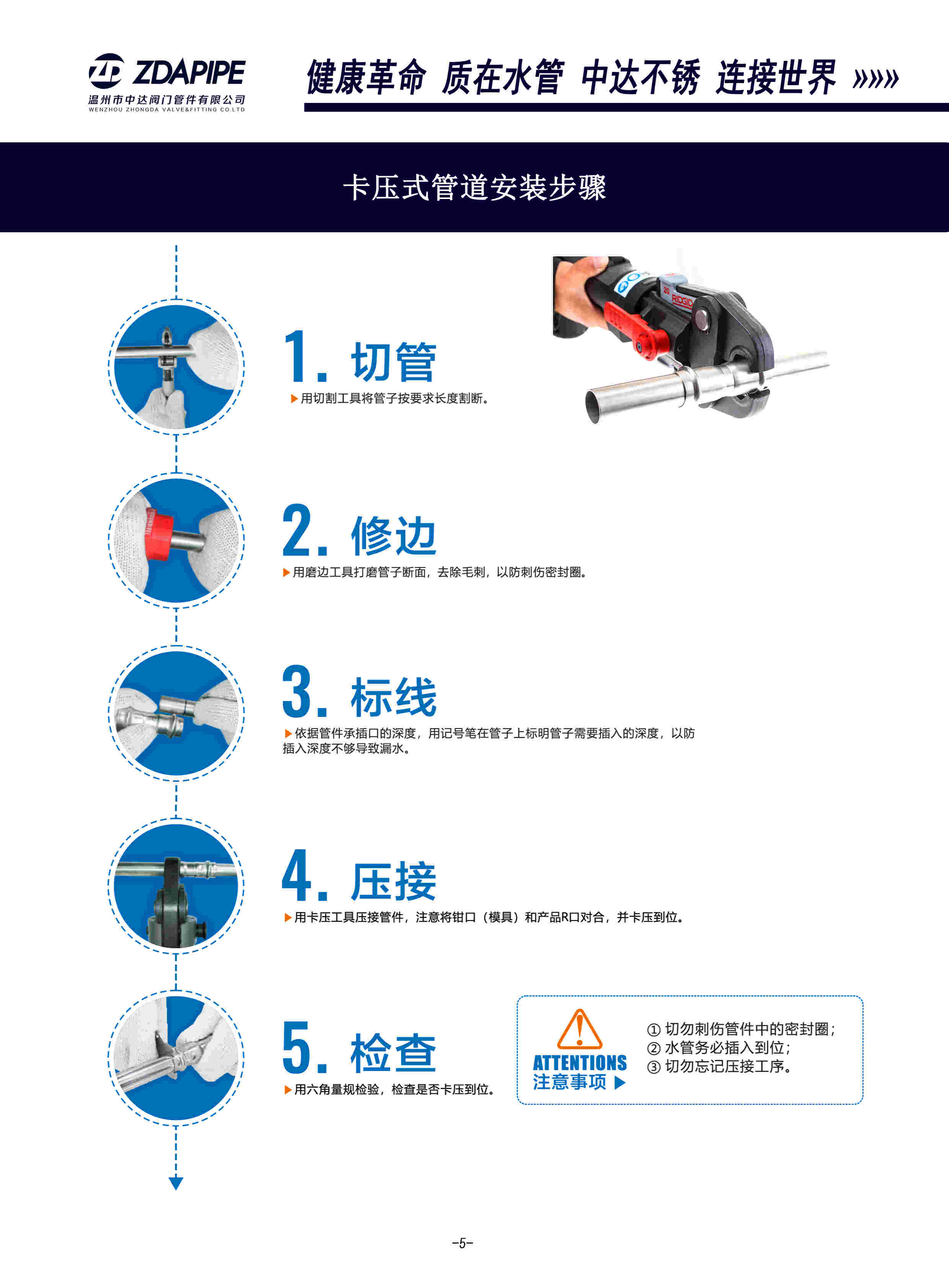 2、安全,卡壓管材和卡壓管件采用的是耐高壓的薄壁不銹鋼材料,厚度更薄,適用于高層,密集型區(qū)域,因本身產(chǎn)品重量輕,便于固定和安裝。雙卡壓管件口小里大,抗拔>3.0 MPa 抗旋轉(zhuǎn)原理:壓成六角形,防止使用中旋轉(zhuǎn)漏水。 密封圈是執(zhí)行國家標(biāo)準(zhǔn)o形密封圈滲漏性的止水,不是堵漏性的止水。