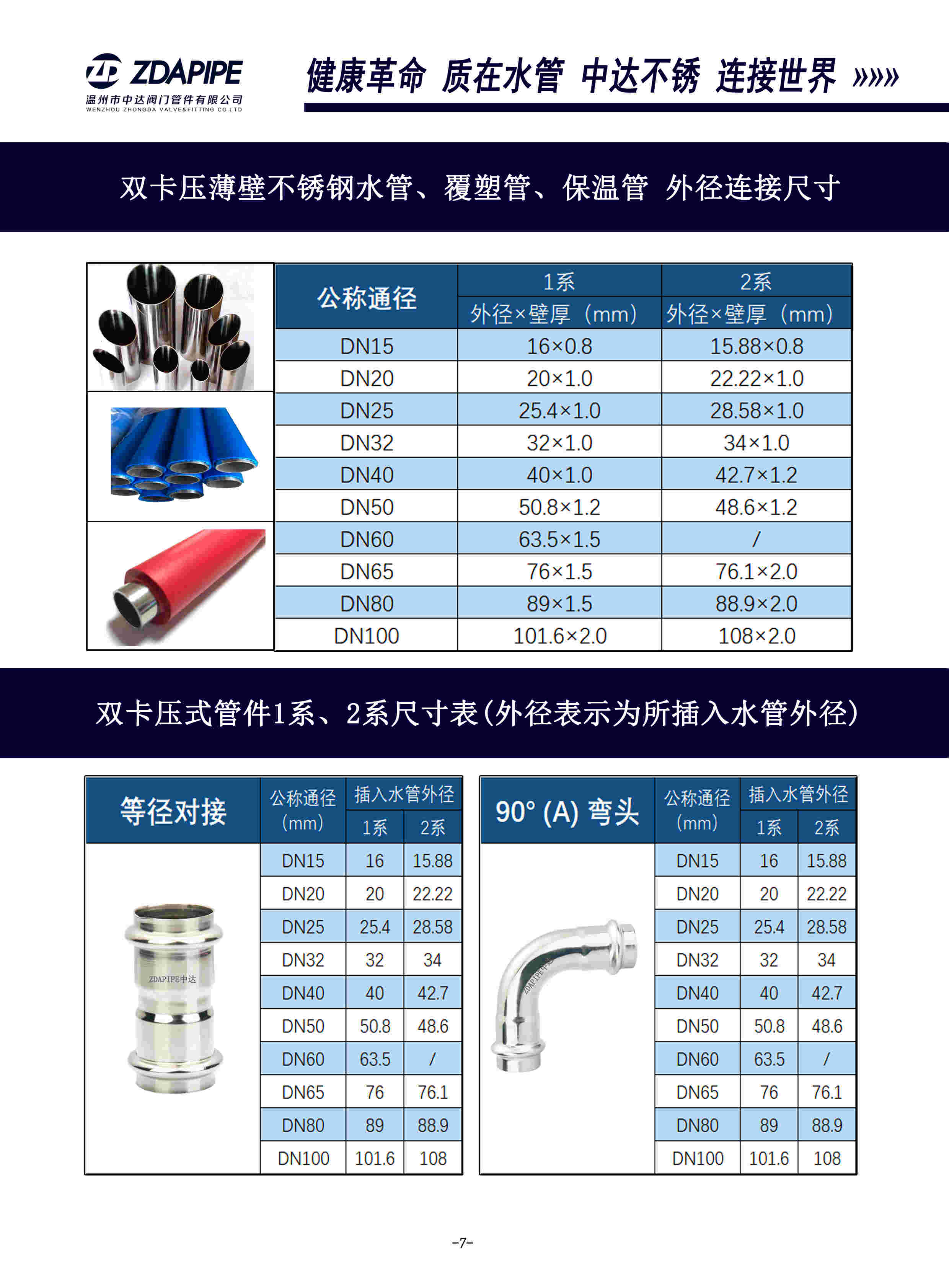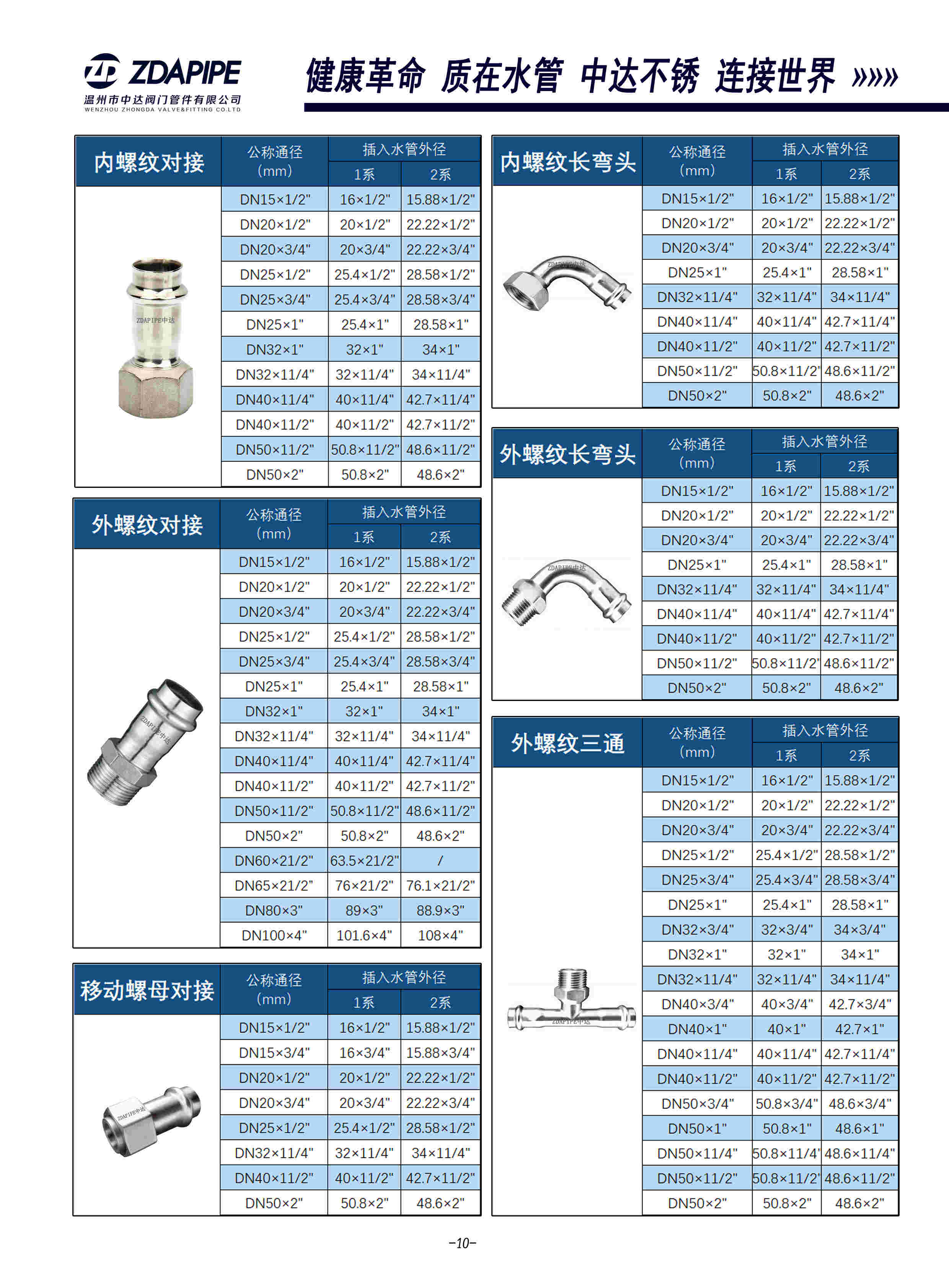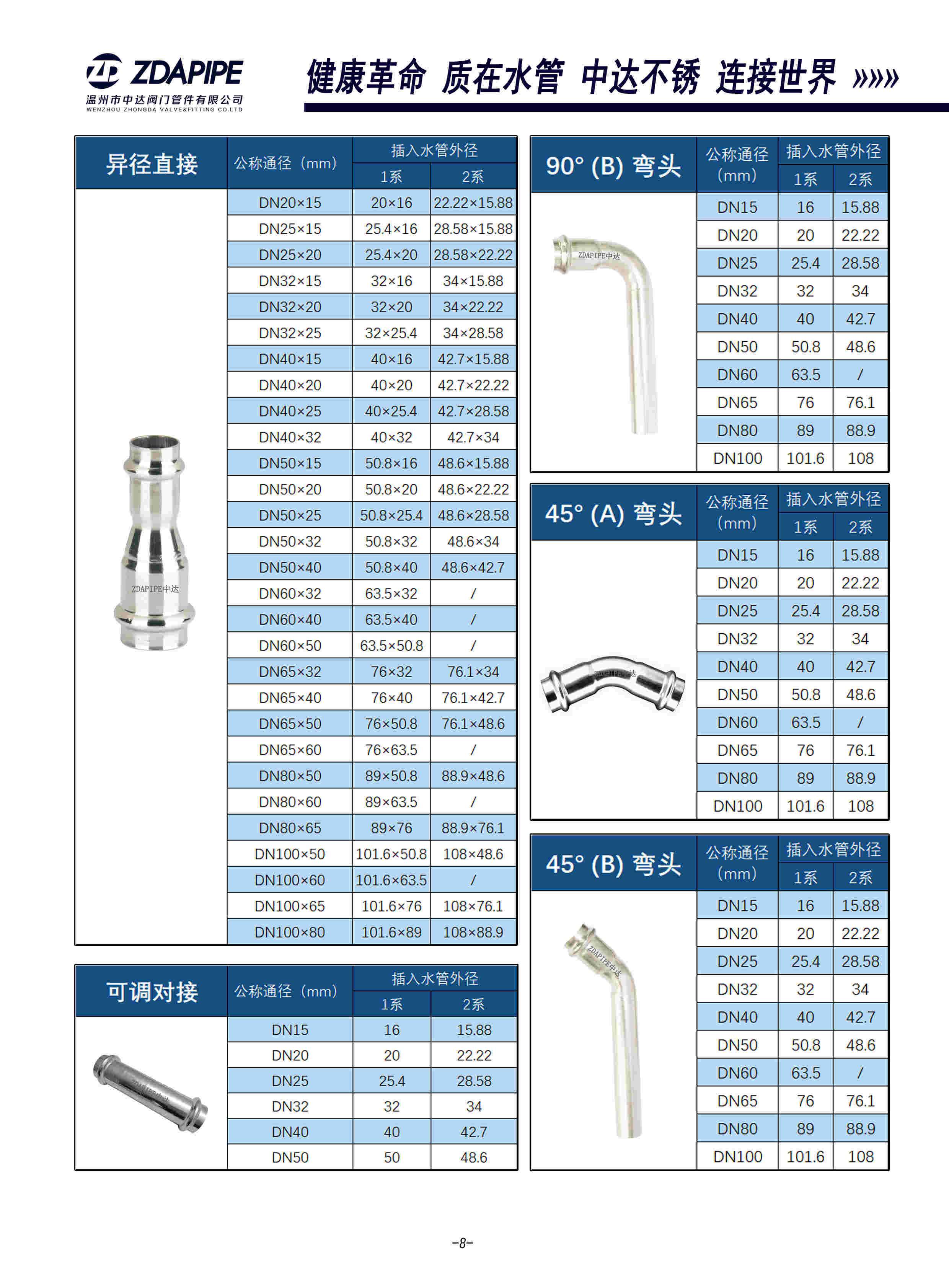 雙卡壓管件是ZDAPIPE中達(dá)公司的核心產(chǎn)品之一,中達(dá)不銹一直深耕不銹鋼制造,是一家歷史悠久的不銹鋼制造企業(yè)。雙卡壓管件連接技術(shù)起源于德國,在上世紀(jì)90年代傳入中國,中達(dá)不銹在不斷的引入和創(chuàng)新技術(shù),無論在制造工藝,設(shè)備等都進(jìn)行了改造和升。雙卡壓管件是未來家庭生活中不可或缺的應(yīng)用產(chǎn)品之一。由于它健康、環(huán)保、便捷、免維護(hù)等優(yōu)勢(shì),未來發(fā)展還將會(huì)處于持續(xù)上升期。