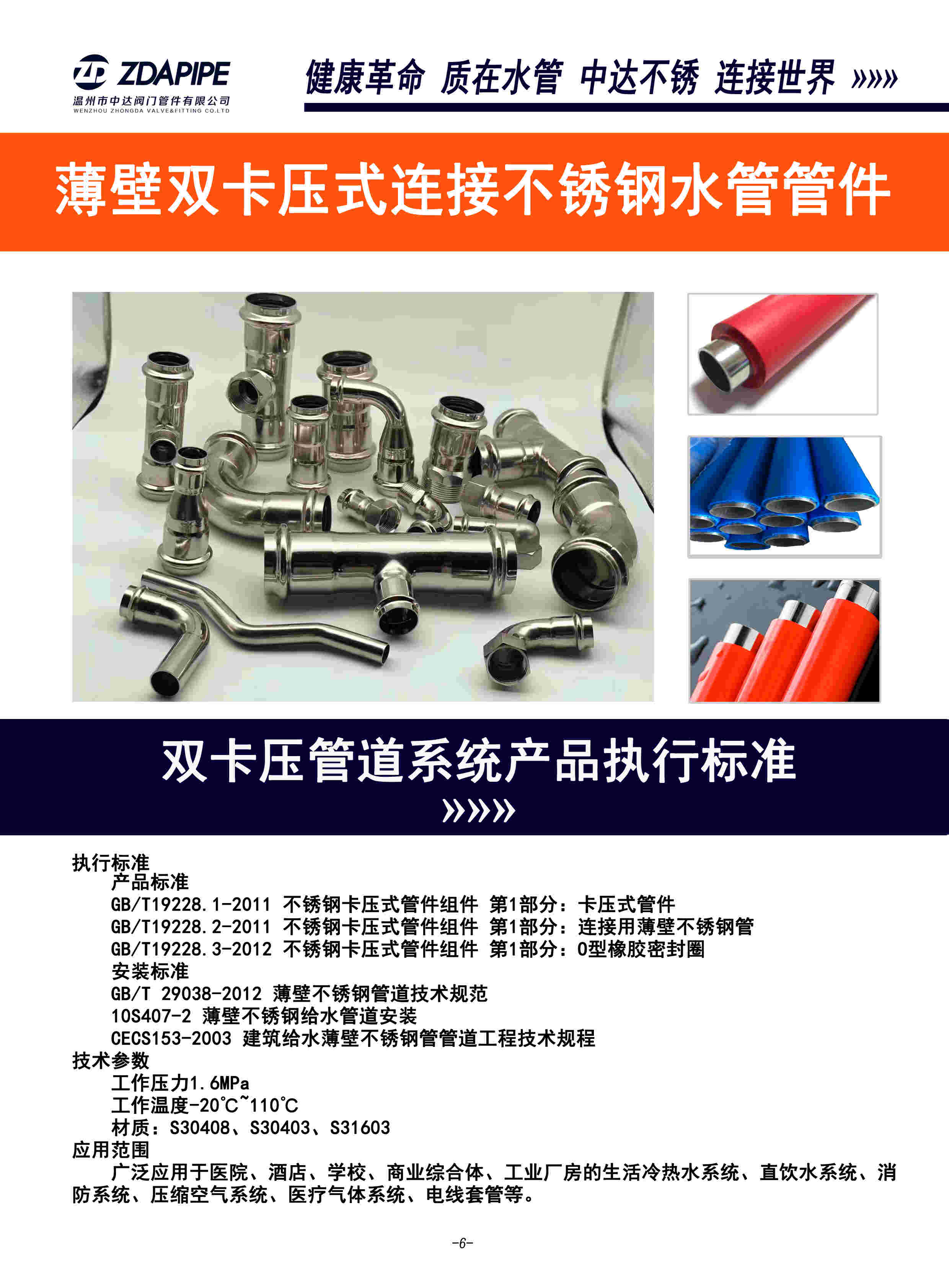 雙卡壓管件廣泛應(yīng)用于市政自來水管道工程,新建小區(qū)直飲水工程,工業(yè)與民用 建筑、賓館、公共建筑、睬氣供應(yīng)等分供水系統(tǒng)。給水,排水,二次供水,太陽能,水務(wù)工程,自來水公司,醫(yī)院,學(xué)校,酒店,賓館,天然氣工程,自來水工程,直飲水工程,家裝水管工程,工業(yè)管道工程,水處理工程,清潔能源工程,綠色能源,核電等領(lǐng)域。健康革命,質(zhì)在水管,中達(dá)不銹,連接世界。